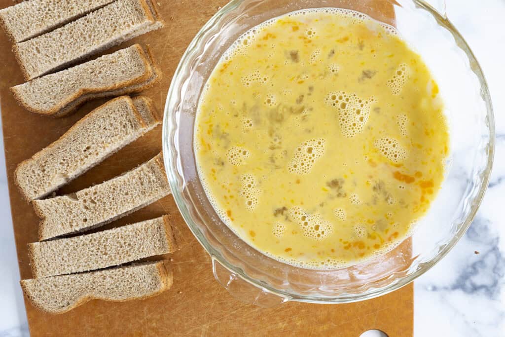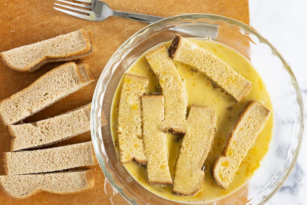 - Dip each piece of bread into the egg mixture, turning over with a fork to coat all sides.