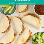 Then, the tacos simply warm on a pan in the oven, get folded and flipped, and are ready for an easy family dinner…in less than 20 minutes.